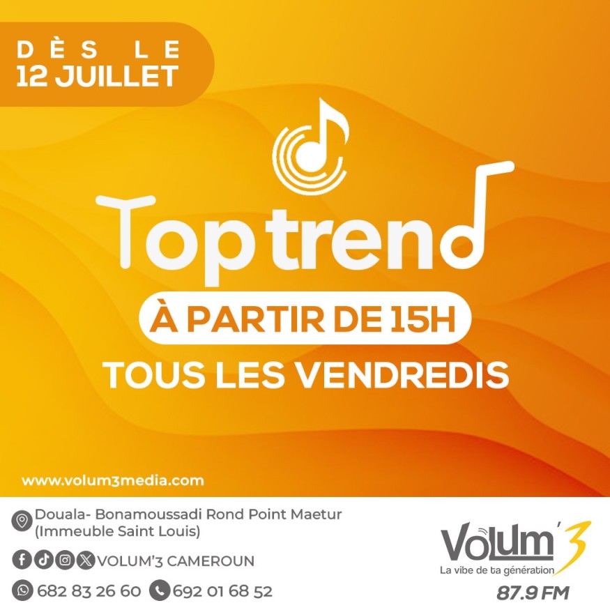 3 mois après le lancement officiel de sa nouvelle grille de programmes, Volum’3 poursuit sa conquête sur les ondes. La Vibe de ta génération amorce une nouvelle étape de son déploiement avec une nouvelle émission qui fera plaisir aux amoureux de la musique : Top Trend